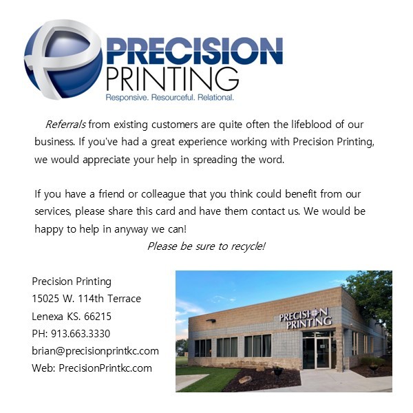 Referrals from existing customers are quite often the lifeblood of our business. If you've had a great experience working with Precision Printing, we would deeply appreciate your help in spreading the word.